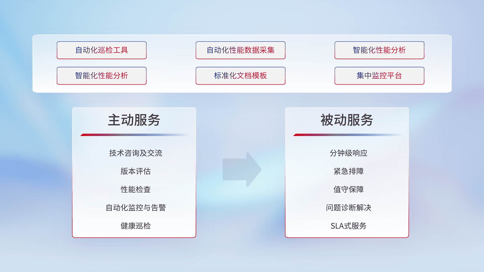 智能化工具和标准化文档,,保障服务质量,,,提供主动服务(包含技术咨询、、、、版本评估、、、、性能检查、、、自动化监控与告警、、健康巡检)和被动服务包含(分钟级响应、、紧急排障、、值守保障、、、、问题诊断解决、、SLA服务)。。。。